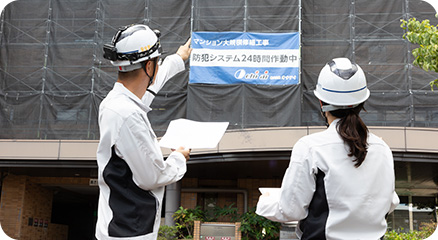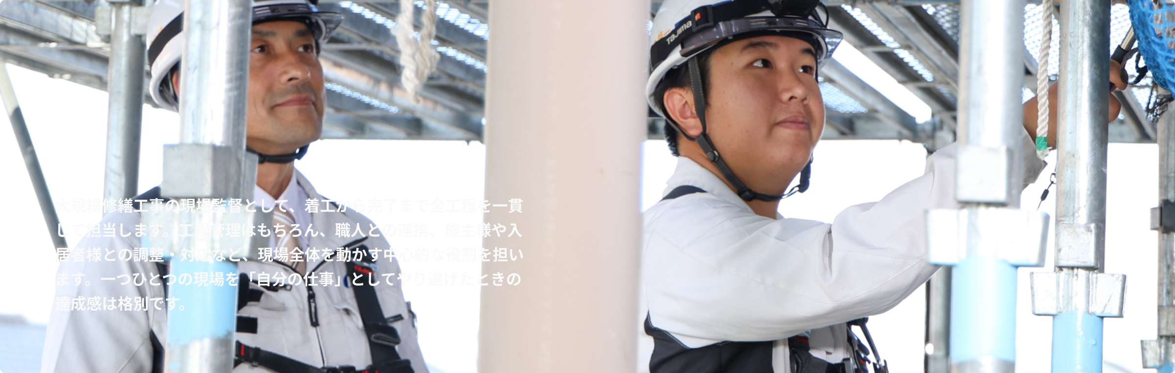 大規模修繕工事の現場監督として、着工から完了まで全工程を一貫して担当します。工程管理はもちろん、職人との連携、施主様や入居者様との調整・対応など、現場全体を動かす中心的な役割を担います。一つひとつの現場を「自分の仕事」としてやり遂げたときの達成感は格別です。
